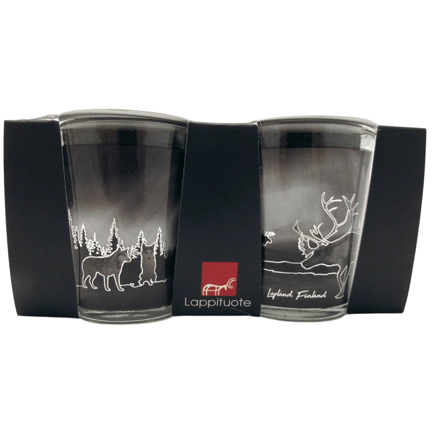 Kaksi lasista snapsilasia paketissa hopeaisella kohokuvioinnilla.