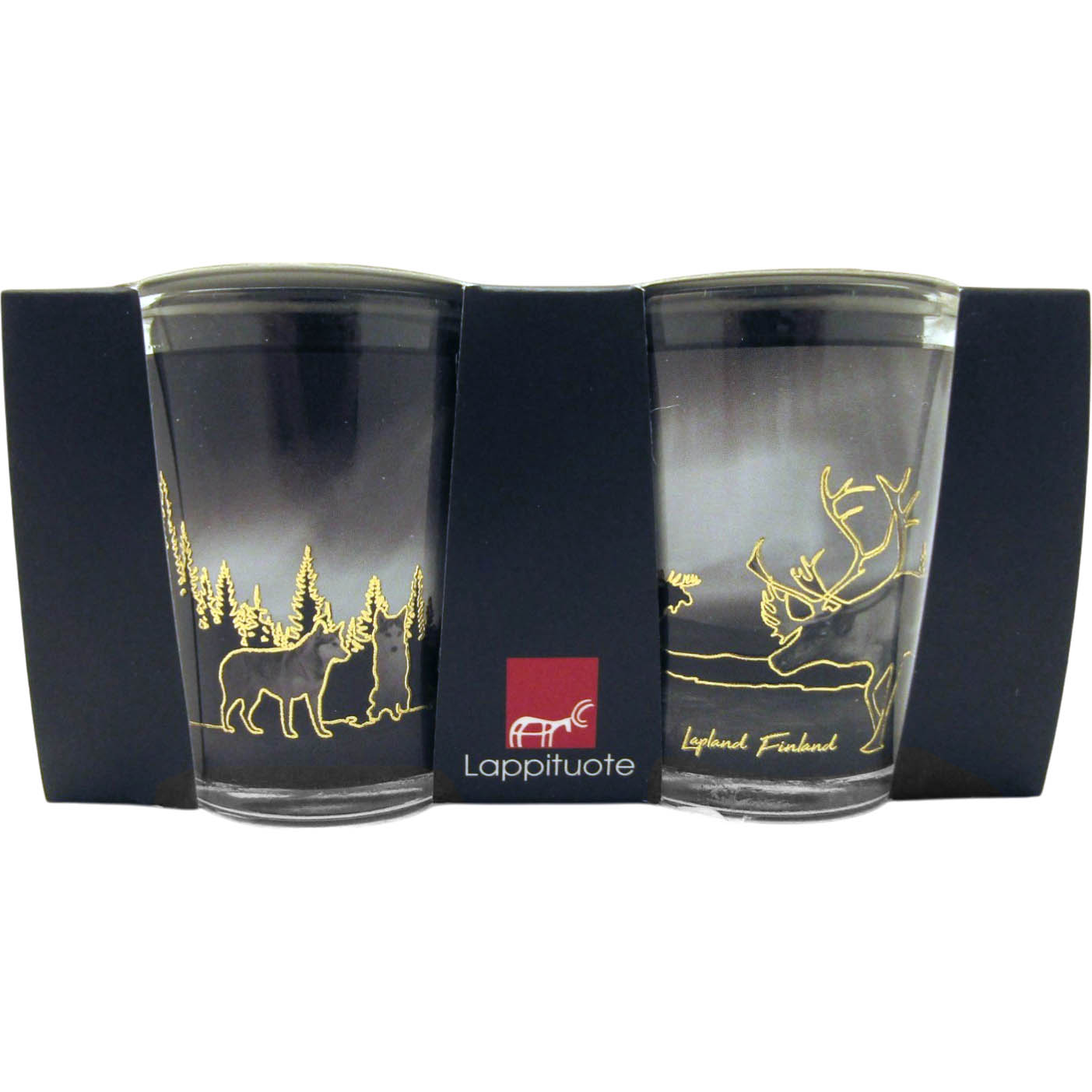 Kaksi lasista snapsilasia paketissa kullatulla kohokuvioinnilla.